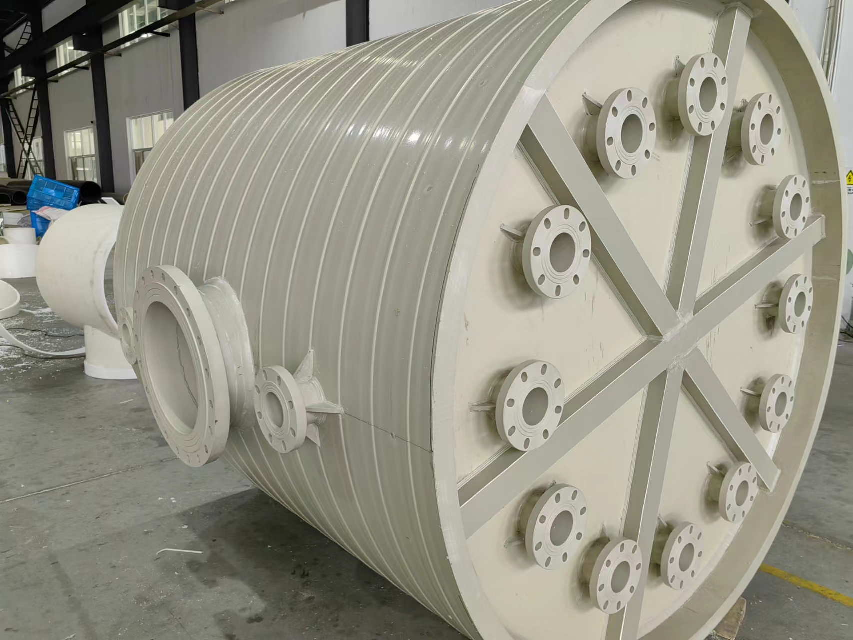 內部焊接是采用自動長臂擠出焊接工藝,是所有工序中重要的一步。將與罐體性質相同的全新PPH顆粒料熱熔在內部焊縫處,與罐底、罐體成一體,原理與外部焊接相同,只是